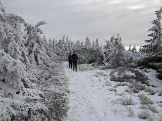 Kroczyliśmy wśród zamarzniętych drzew, podziwiając zielone doliny skąpane w chmurach. Daleko, po lewej stronie dojrzeliśmy nawet Ještěd, szczyt w Czechach w okolicy Liberca.